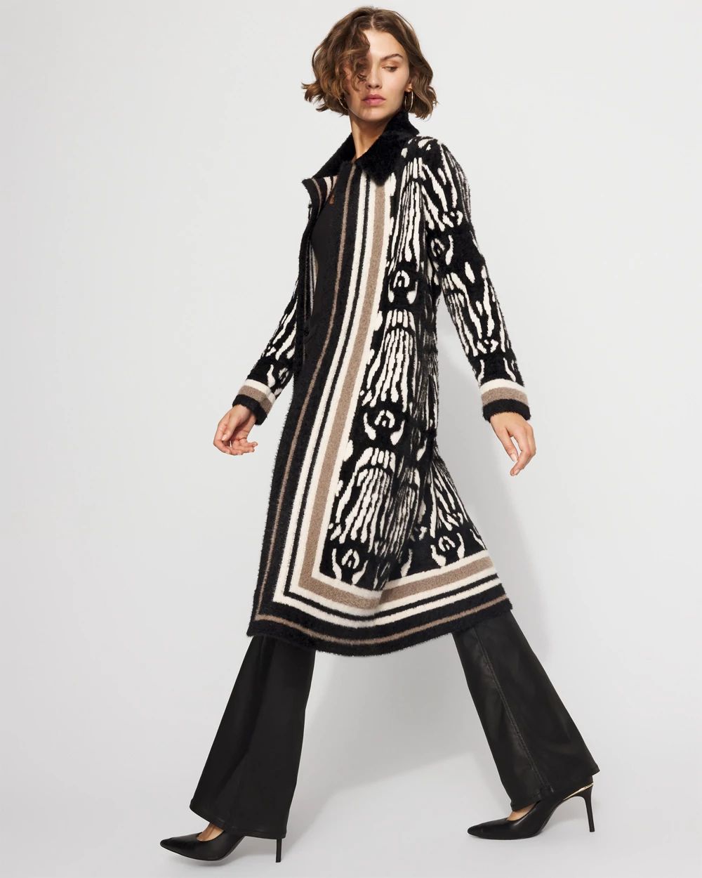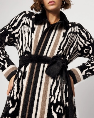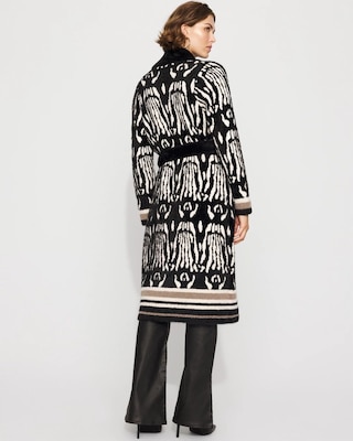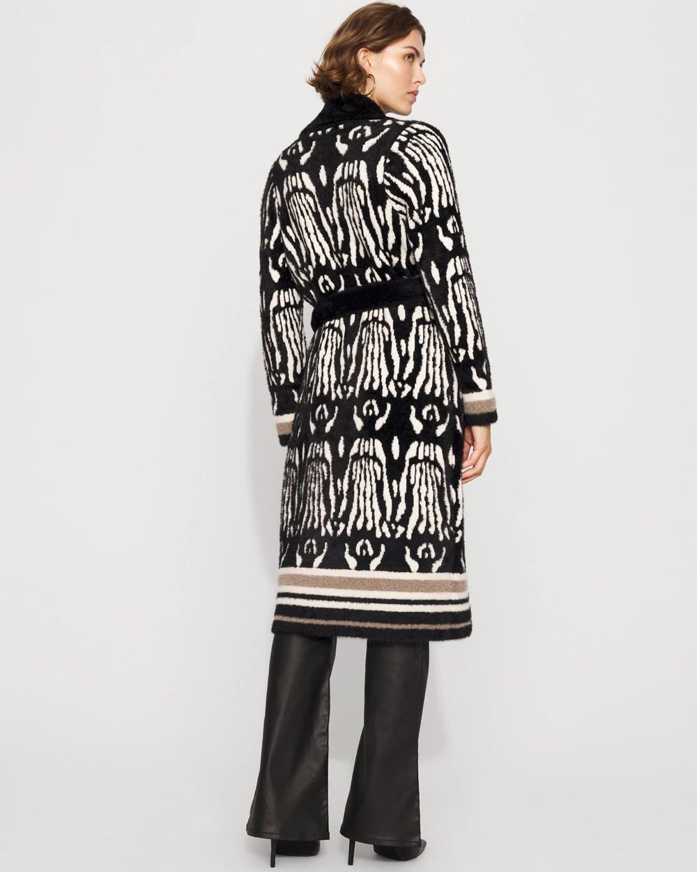 Reach for this statement sweater coat on cold days and nights. Made from very soft and warm knit fabric, jacquard print gives it an eye-catching appeal. The shawl neck adds interest, and the removable tie-waist belt gives it shape. Wear it open over tees and tops paired with denim or pants.